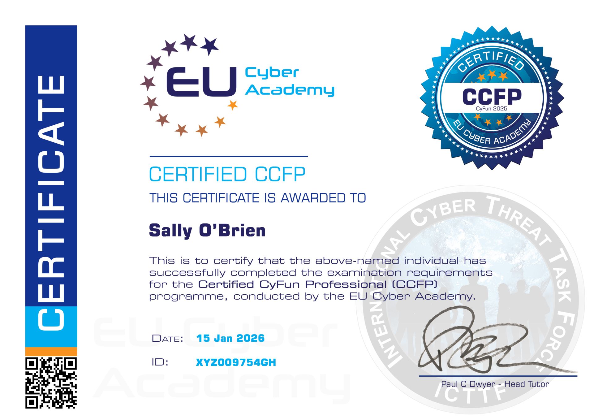 The Certified CyFun Professional (CCFP) is a professional certification programme. The credential is awarded based on demonstrated competence, not attendance.